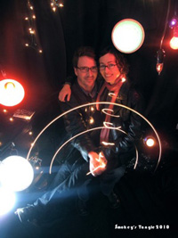 So this little gallery has been around for awhile, opening in February of 2009, but somehow I had yet to step inside their door until last Friday. I was surprised at the tiny size of their space as I’d been hearing about the gallery for some time. We walked past the striking sculpture in the display window (Andrew Dilberger) to be greeted a photographer standing on top of a table in front of a small holiday photo booth strung with clip lamps and xmas lights. Do you want to have your picture taken? Hell yes! So we donned some twinkle lights and spun them round for the slow exposure, and although I think we look pretty dorky, that seems about right.