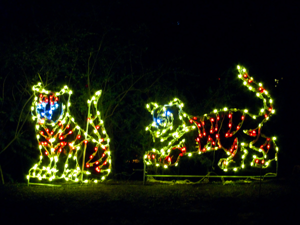 Shown below is the Holiday Light Show Safari that’s set up in the zoo’s meadow. It’s a light show sychronized to a musical/theatrical soundtrack, and if I were to be totally honest (which I am), I would have to say that this was somewhat disappointing, at least for grown-ups. The lights were great, but the medley soundtrack was an awful disjointed mismash of stuff that might appeal to the sensibilities of a 2 year old, but frankly, was just plain bad. It could have been way cooler. Sorry.